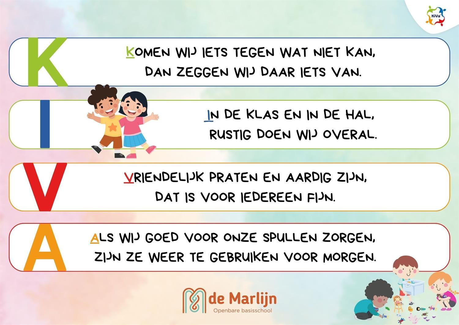 KiVa is een preventief, schoolbreed programma gericht op het versterken van de sociale veiligheid en het tegengaan van pesten op basisscholen. KiVa is een Fins woord en staat voor 'plezier'en voor 'tegen pesten'. De methodiek zet in op positieve groepsvorming en stimuleert de sociale vaardigheden en de sociaal emotionele ontwikkeling van kinderen. Daarmee worden de sociale veiligheid en het pedagogisch klimaat op de Marlijn verbeterd. Binnen KiVa ligt de nadruk op de groep als geheel en dus niet op specifieke individuen. Ons motto luidt dan ook: Samen maken we er een fijne school van! De lessen van KiVa zijn verweven in ons onderwijsaanbod aan de kinderen.